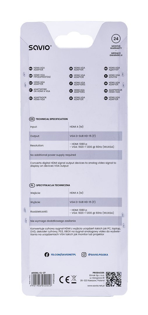 Adapter SAVIO cl-27 (HDMI M - D-Sub (VGA) F; 0,10m; kolor biały)