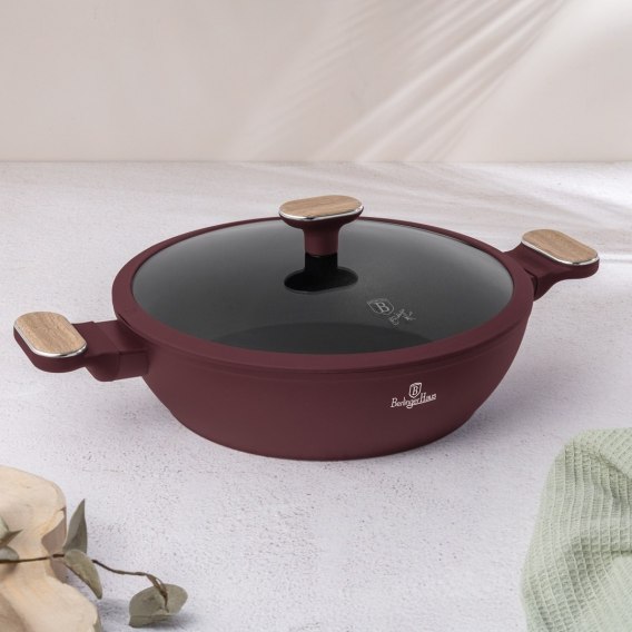 Wykonanie: Wysokiej jakości kute aluminium Powłoka wewnętrzna: Tytanowa   Pokrywka: Szkło hartowane Kolor: Bordowy mat z el. drewn Wymiary: Ø28 x 7,5cm Pojemność: 3,8L